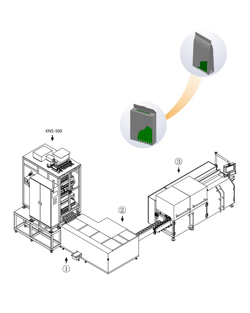 本全自動包裝生產線。由KNS-500自動條狀多列機、稱重部分、計數整列系統、自動裝盒部分組成,可以自動完成從原料灌裝到稱重剔除,自動計數整列到自動裝盒的一系列過程。此全自動生產線可以大大減少勞動力,獲得高效率。
